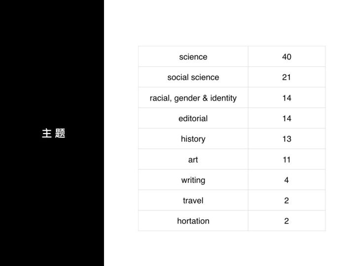 總結的一共是四十五套真題,其中274篇,當時45篇,整體不止274篇;只是只有其中274篇找到了題源。那麼在這174篇裡面,science 佔到了40篇。佔的是最多的,所以如果你對於類似biology, chemistry 等基本沒有內容的攝入的話,建議可以稍微功利的接觸下。當然本身science 佔比比較高,是一件讓人欣慰的事情。因為理科形的文章邏輯比較直白,比較容易讀懂。其次是social science 的,包括psychology, education 等,佔到了21。 種族,比如黑人問題,gender ,比如男女平等問題 這一塊佔到了 14篇,所以世界觀類型的文章也要接觸下。其他的就是常見的社論類的(editorial),還有美國歷史、藝術相關的。剩下的積累就比較少了。