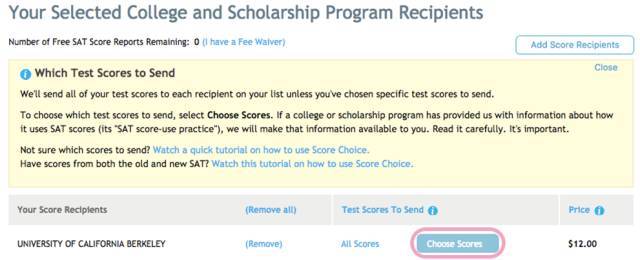 Score Choice功能允許考生選擇性地向申請院校遞送分數。SAT Reasoning考試可以選擇某個考試日期的分數,也就是說,要送就一次成績一起送,不可以選擇這次的閱讀和那次的語法組合。SAT Subject考試可以按科目送分,比如這次考了3門,但可以只送2門成績。