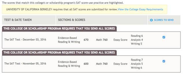 大學會提取申請者提交的所有SAT考試成績的最高一部分分數,即所有成績中單門的最高分數相加(但大學會參考申請者提交的所有成績)。申請者可以自由提交任何想提交給大學的新的更高分數。