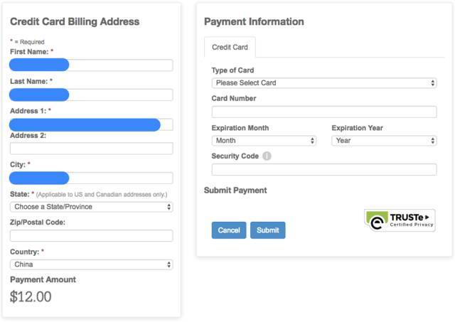 Step 10、填寫信用卡信息。左側的信用卡賬單地址是默認的,可以直接使用。填好右側的信用卡信息以後, 點擊「Submit」,信用卡扣款成功,送分完成。
